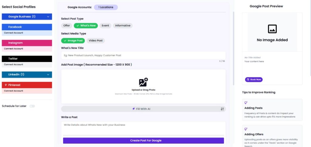 Introducing our exclusive AI-powered social media automation tool that helps you create, schedule, and post content across Facebook, Instagram, LinkedIn and Google My Business effortlessly.